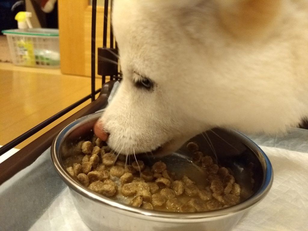 今はだいぶ良くなって、いい感じの固さ・色のうんちが出ていますが、念のためドッグフードをふやかしてあげてます。