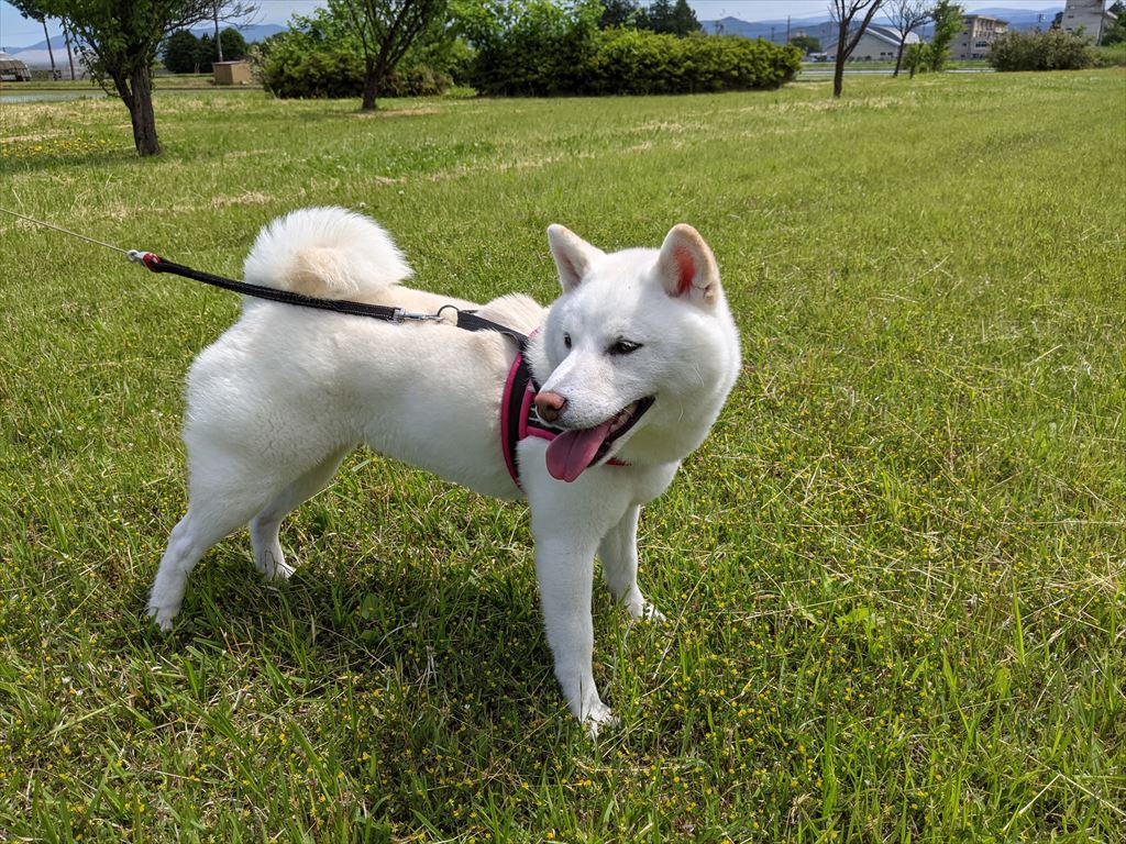 今日のお散歩 お散歩 2018.09.232018.09.25 今朝は昨日の雨空から一転して、晴れてよい天気です。 いつもの公園は草がだいぶ伸びてきてますが、晴れている日は気持ちよいです。 お散歩で歩き回った後は、お家で一休み。 夕方、盛岡中央公園をお散歩したら、お友達のコーギー、けんちゃんに出会いました。 けんちゃんは明日、テレビ岩手で放送している5きげんテレビに出演予定だそうです。テレビ出演するなんて、すごいなぁ。